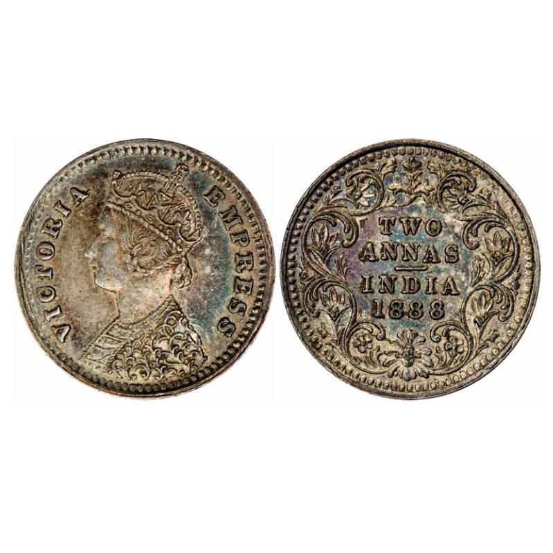 Victoria Empress, Silver, 2 Annas, 1888, Bombay Mint, B/II, 'B' incused, Ghost on Obv. GK 785. About Uncirculated. Rare.