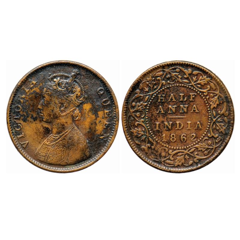 Victoria Queen, Copper, Half Anna, 1862, Madras Mint, A/I, Smudged type flowers. GK 390. About Extremely Fine, Details. Scarce.
