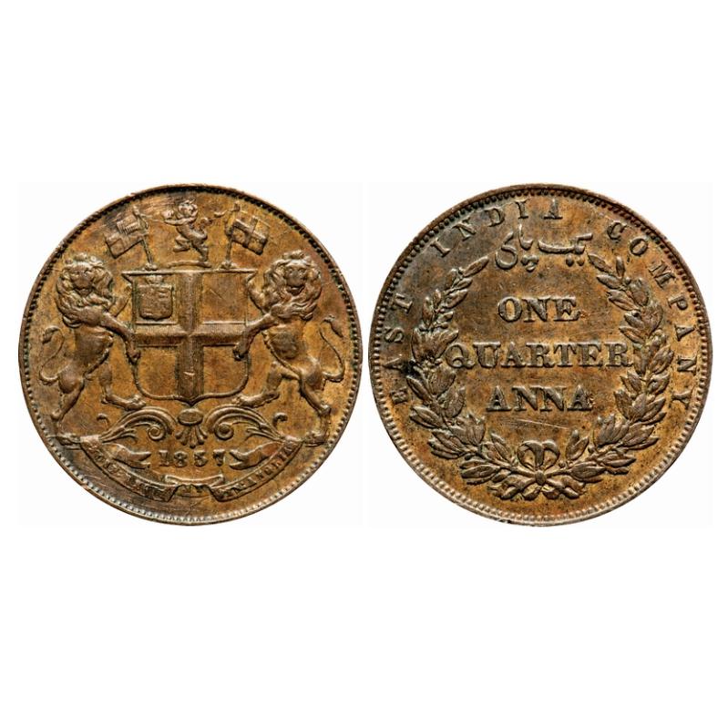 Victoria Queen, Copper, Quarter Anna, 1857, Birmingham Mint, Single leaf, Rev inverted. GK 229. Extremely Fine. Very Scarce.