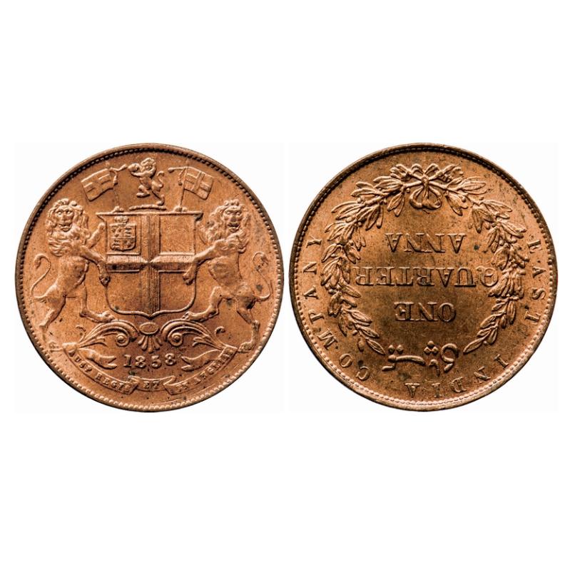 Victoria Queen, Copper, Quarter Anna, 1858, J. Watt & Co. Birmingham Mint, Silgle leaf, Year numera...