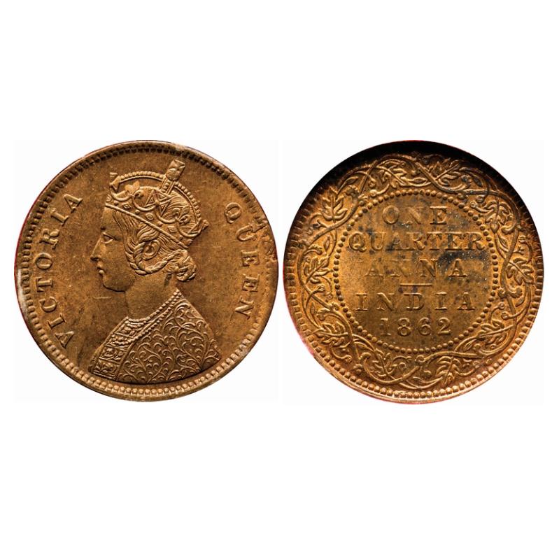Victoria Queen, Copper, Quarter Anna, 1862, Bombay Mint, A/I, Tiny 'V' incused, Planchet flaw on Obv, Die crack on Obv. GK 397. NGS Slabbed AMS 55. Very Scarce. |