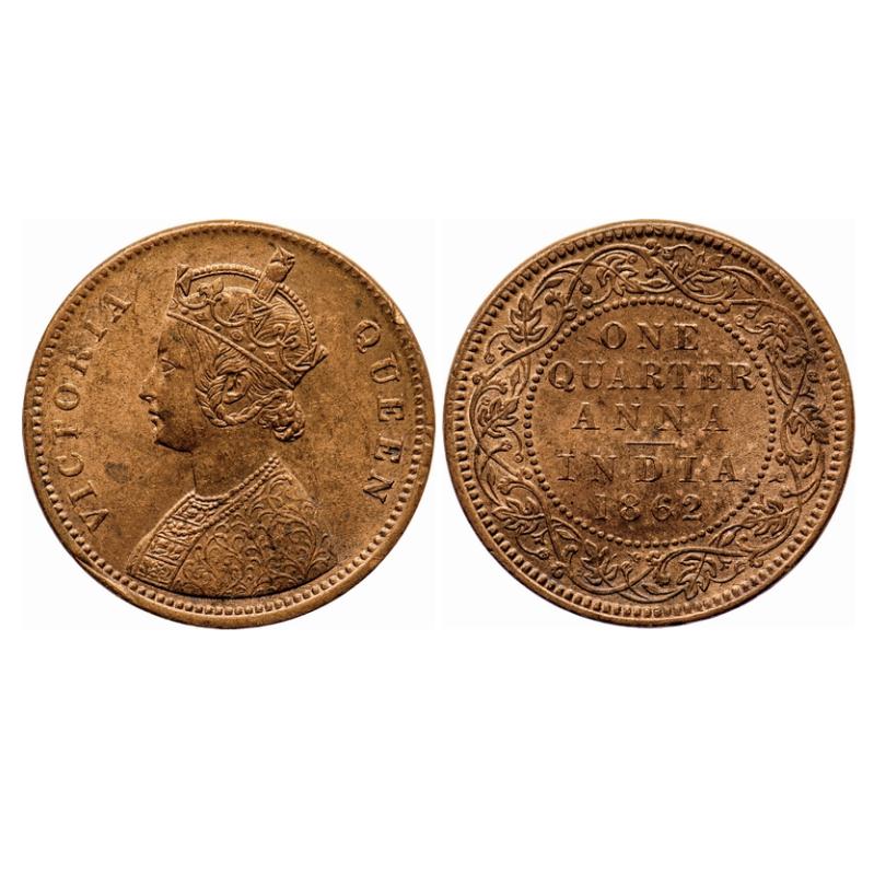 Victoria Queen, Copper, Quarter Anna, 1862, Madras Mint, A/I, No mint mark. Multiple die cracks on ...
