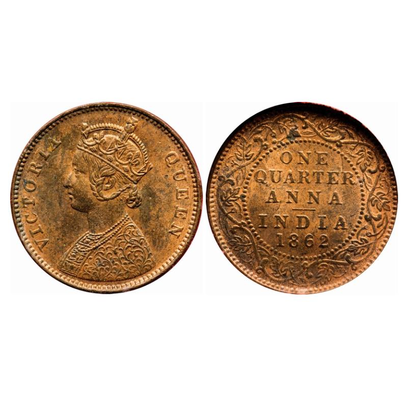 Victoria Queen, Copper, Quarter Anna, 1862, Madras Mint, A/I, No privy mark, No mint mark, Ghost on Rev. GK 399. NGS Slabbed XF 45 Details. Scarce. |