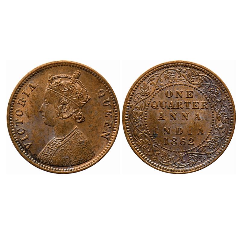 Victoria Queen, Copper, Quarter Anna, 1862, Madras Mint, A/I, No mint mark. Multiple die cracks on Obv and Rev, Die doubling of 'Victoria' 'Queen'. GK 399. Uncirculated, Rainbow Toned. Very Scarce. |