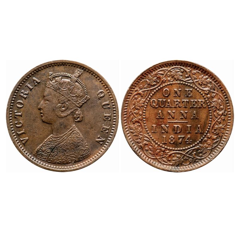 Victoria Queen, Copper, Quarter Anna, 1874, Calcutta Mint, B/II, No mint mark. GK 823. Very Fine+. Scarce.