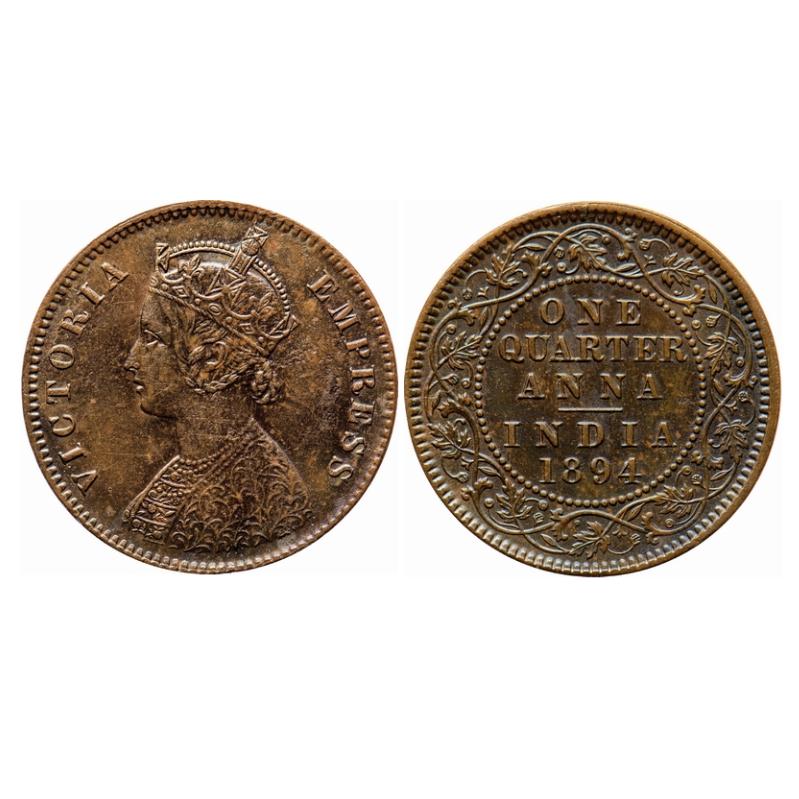 Victoria Empress, Copper, Quarter Anna, 1894, Calcutta Mint, B/II, No mint mark. GK 853. About Uncirculated, Rainbow Toned. Scarce.