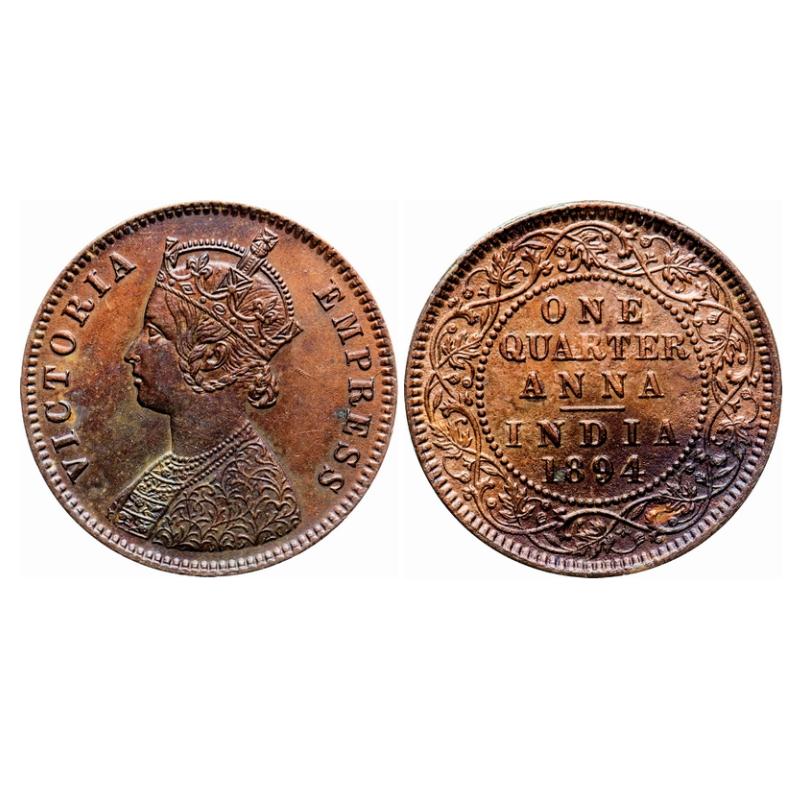 Victoria Empress, Copper, Quarter Anna, 1894, Calcutta Mint, B/II, No mint mark, Die crack on Obv, Ghost on rev. GK 853. Uncirculated, toned. Very Scarce. |