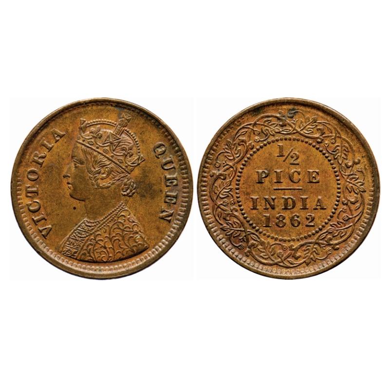 Victoria Queen, Copper, 1/2 Pice, 1862, Calcutta Mint, A/I. GK 401. Almost Uncirculated. Very Scarce.