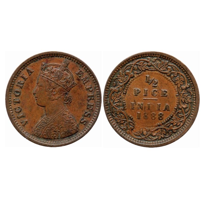 Victoria Empress, Copper, 1/2 Pice, 1888, Calcutta Mint, A/I, No Mint mark. GK 868. About Extremely Fine, Details. Scarce.
