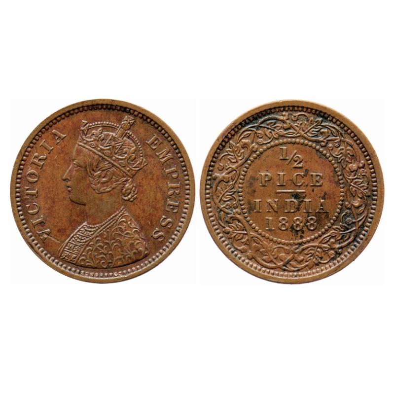 Victoria Empress, Copper, 1/2 Pice, 1888, Calcutta Mint, A/I, No Mint mark. GK 868. Extremely Fine+. Very Scarce.