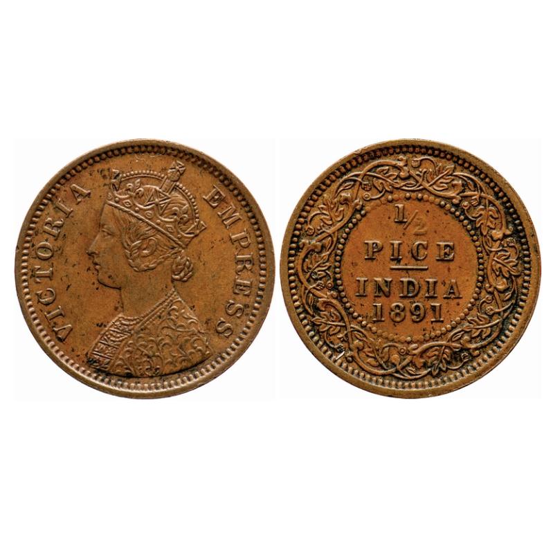 Victoria Empress, Copper, 1/2 Pice, 1891, Calcutta Mint, A/I, No Mint mark, Die cracks on Queens Jabot, Numeral 2 of 1/2 is die filled. GK 871. About Uncirculated. Rare. |