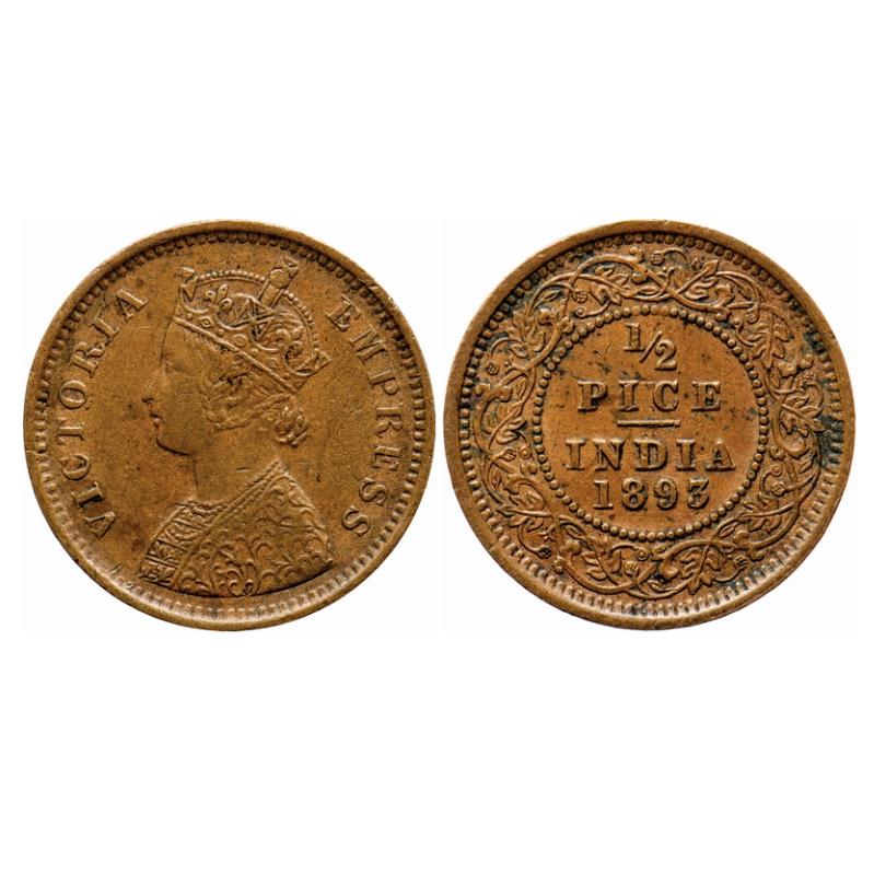 Victoria Empress, Copper, 1/2 Pice, 1893, Calcutta Mint, A/I, No mint mark, Ghost on Rev. Alphabate 'E' of Empress broken, Die cracks on Obv. GK 873. Extremely Fine. Scarce. |