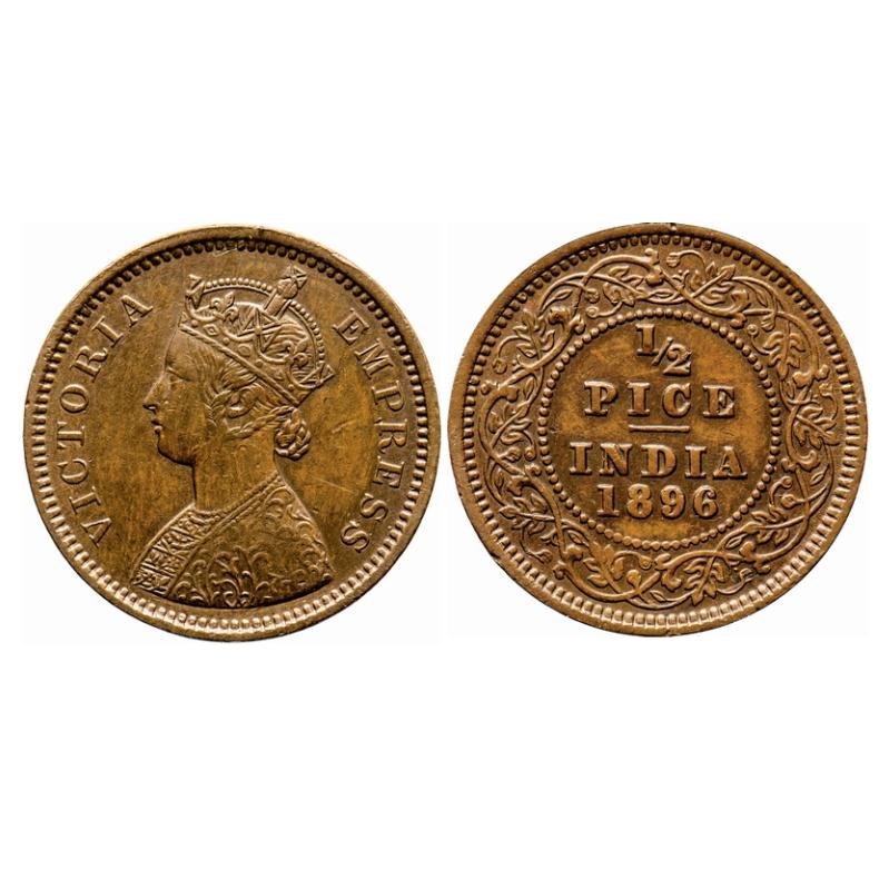 Victoria Empress, Copper, 1/2 Pice, 1896, Calcutta Mint, A/I, No mint mark. GK 876. Extremely fine. Scarce.