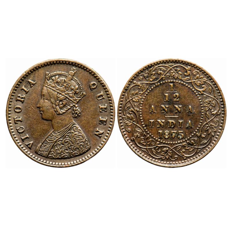 Victoria Queen, Copper, 1/12 Anna, 1875, Calcutta Mint, Obv A, No mint mark, Die crack on Obv. GK 886. Very Fine+, Details. Scarce. |