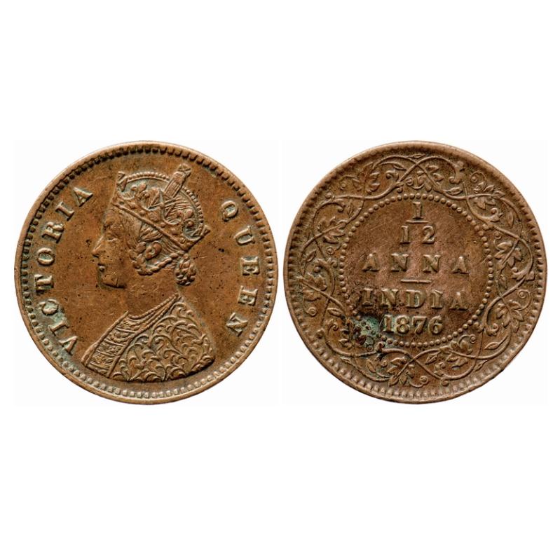 Victoria Queen, Copper, 1/12 Anna, 1876, Calcutta Mint, Obv A, No mint mark. GK 888. Extremely Fine Details, Cleaned. Very Scarce.