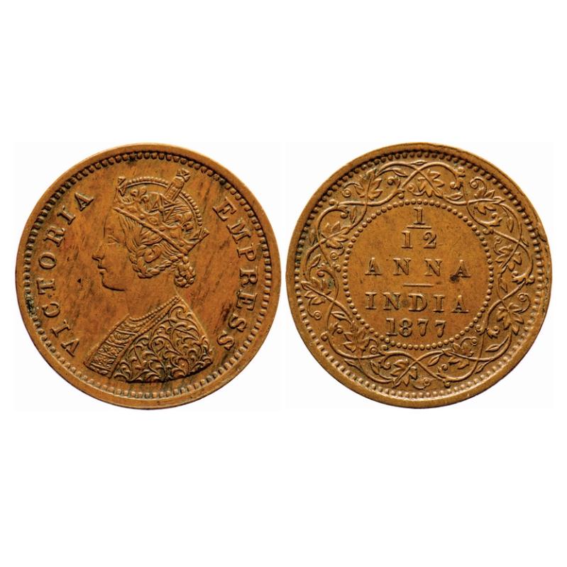 Victoria Empress, Copper, 1/12 Anna, 1877, Bombay Mint, Obv A, No mint mark, Few cuds on Rev rim edge. GK 889. About Uncirculated. Rare.