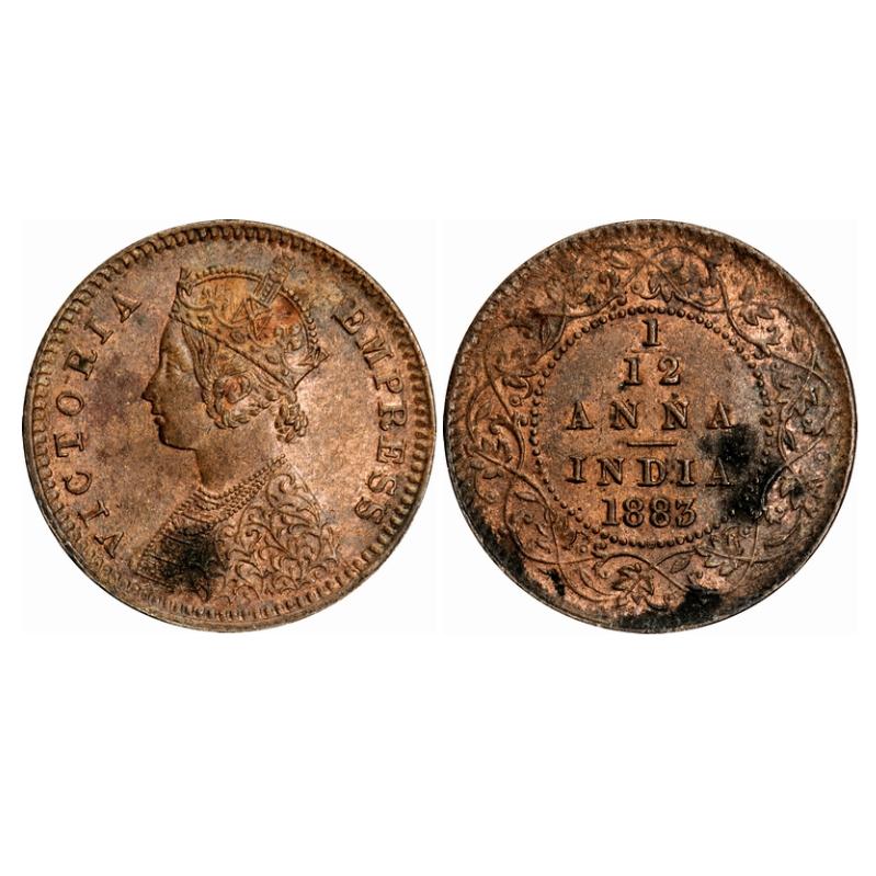Victoria Empress, Copper, 1/12 Anna, 1883, Calcutta Mint, Obv 'B', 'C' incused. GK 896. Uncirculated, Details. Rare.
