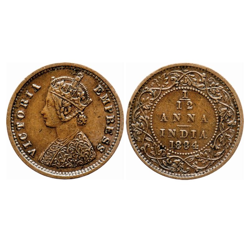 Victoria Empress, Copper, 1/12 Anna, 1884, Bombay Mint, Obv A, No mint mark, Nick on Obv rim edge. GK 898. Very Fine, Details. Scarce. |