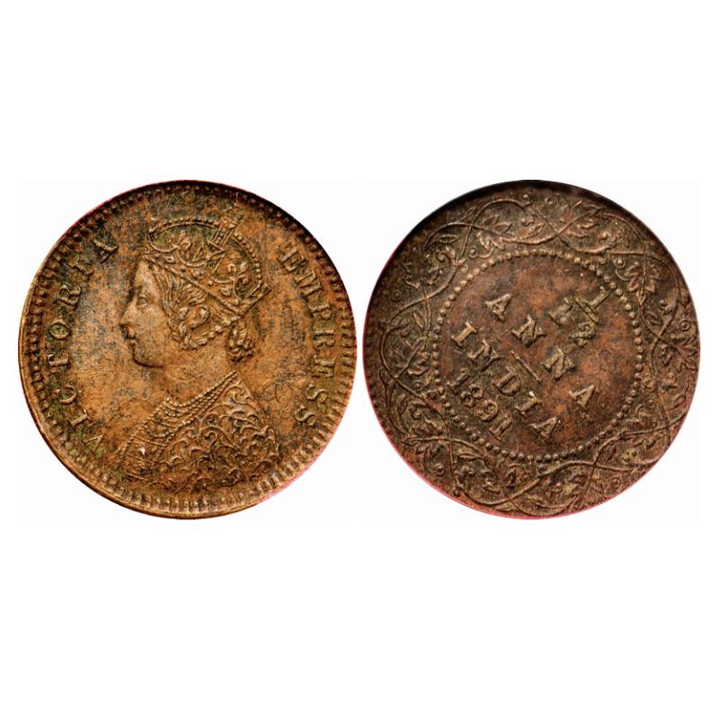 Victoria Empress, Copper, 1/12 Anna, 1891, Calcutta Mint Obv B, No mint mark, Ghost on Obv, Die rotation on Rev. GK 912. NGS Slabbed XF 45, Details. Scarce. |