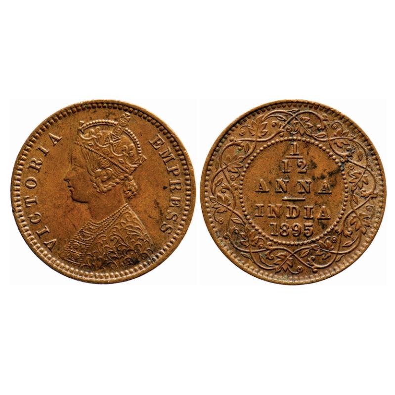 Victoria Empress, Copper, 1/12 Anna, 1895, Calcutta Mint, Obv B, No mint mark, Die cracks on Obv. GK 916. Uncirculated. Rare.