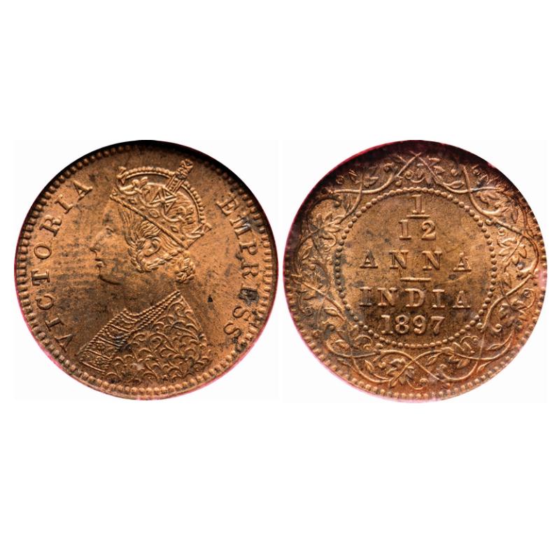 Victoria Empress, Copper, 1/12 Anna, 1897, Calcutta Mint, Obv B, No mint mark, Ghost on Rev. GK 918. NGS Slabbed MS 62+ BN Superb Details. Rare.