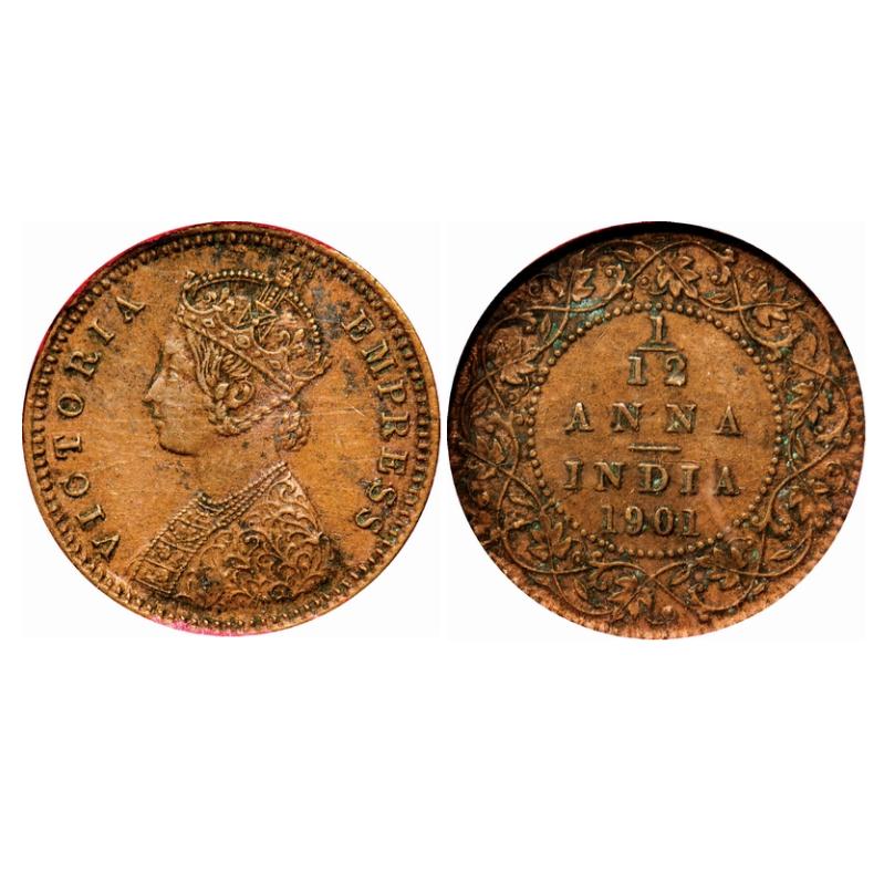 Victoria Empress, Copper, 1/12 Anna, 1901, Calcutta Mint, Obv B, No mint mark, 1 o'clock on Rev, Di...