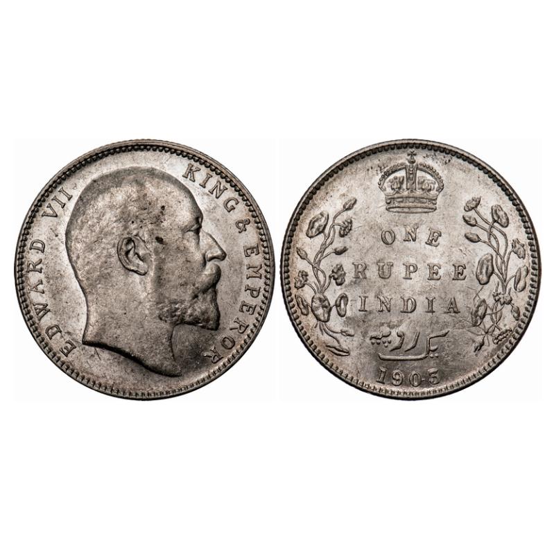 Edward VII, Silver, Rupee, 1903, Bombay Mint, 'B' incused, Dot, Few scratches on Rev, With original mint luster. GK 926. Extremely Fine. Scarce. |
