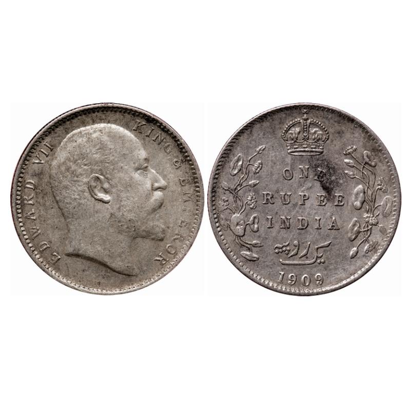 Edward VII, Silver, Rupee, 1909, Calcutta Mint, No mint mark, Ghost on Rev. GK 950. NGS Slabbed XF 45+. Very Scarce.