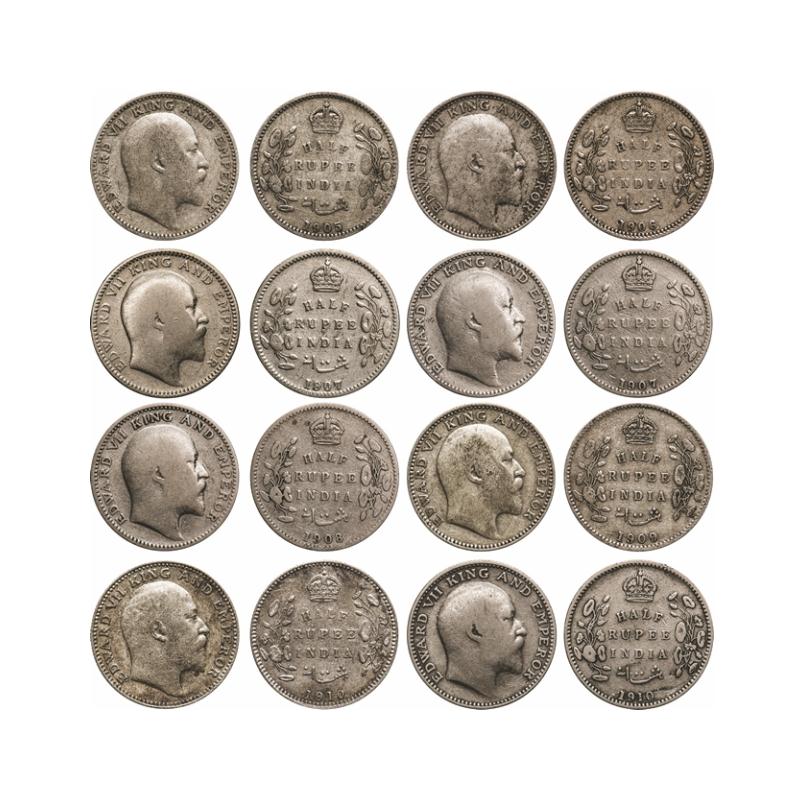 Edward VII, Silver, Half Rupee (8 Coins), 1905, Calcutta Mint, No mint mark, 1906, Calcutta Mint, No mint mark, 1907, Bombay Mint, 'B' incused and dot, 1907, Calcutta Mint, No mint mark, 1908, Calcutta Mint, No mint mark, 1909, Calcutta Mint, No mint mark, 1910, Bombay Mint, 'B' incused and dot, 1910 Calcutta Mint, No mint mark. GK 960, 964, 965, 967, 968, 969, 970, 971. Fine+ to Extremely Fine. Scarce as a lot. |