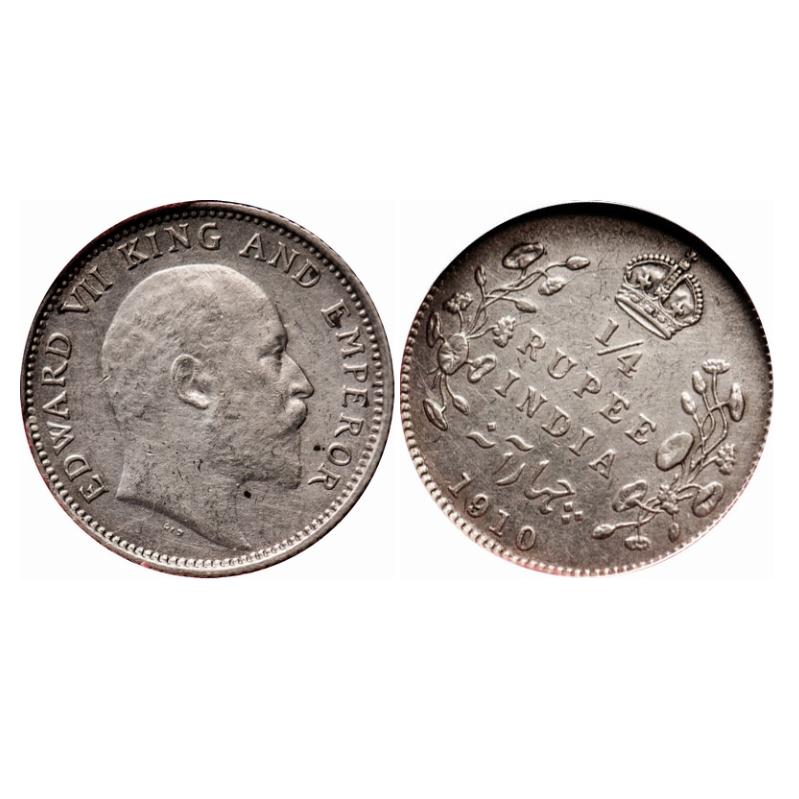 Edward VII, Silver, 1/4 Rupee, 1910, Calcutta Mint, No mint mark, 11 o'clock die rotation on Obv. G...