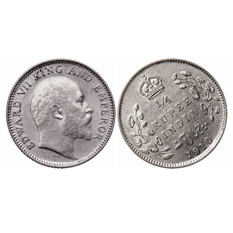 Edward VII, Silver, 1/4 Rupee, 1910, Calcutta Mint, No mint mark, 11 o'clock die rotation on Obv. GK 978. About Uncirculated, Cleaned. Very Scarce.