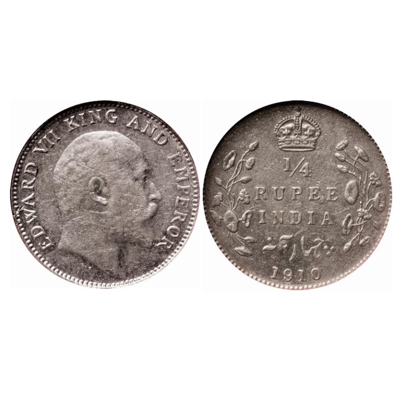 Edward VII, Silver, 1/4 Rupee, 1910, Calcutta Mint, No mint mark, 11 o'clock die rotation on Obv. G...
