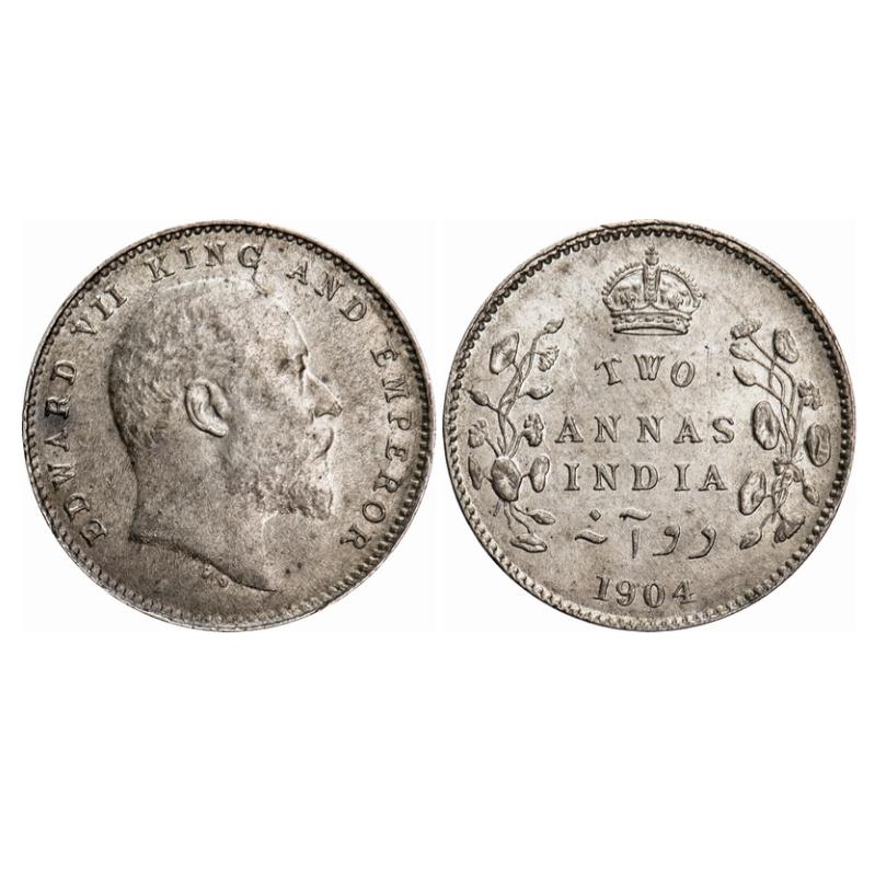 Edward VII, Silver, 2 Annas, 1904, Calcutta Mint, No mint mark. Die crack on Obv, Ghost on Rev. GK 981. Uncirculated. Very Scarce.