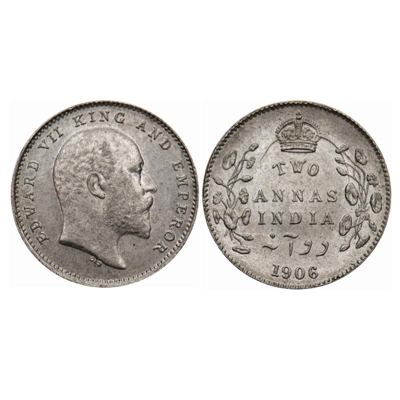 Edward VII, Silver, 2 Annas, 1906, Calcutta Mint, No mint mark, Ghost on Rev. GK 983. Uncirculated. Scarce.