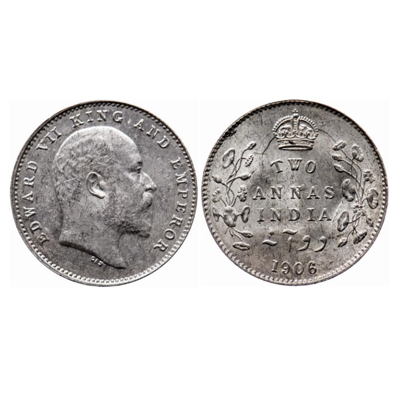 | Edward VII, Silver, 2 Annas, 1906, Calcutta Mint, No mint mark, Full head ghost on Rev, Die crack on Obv, With original mint luster. GK 983. Uncirculated. Very Scarce. |