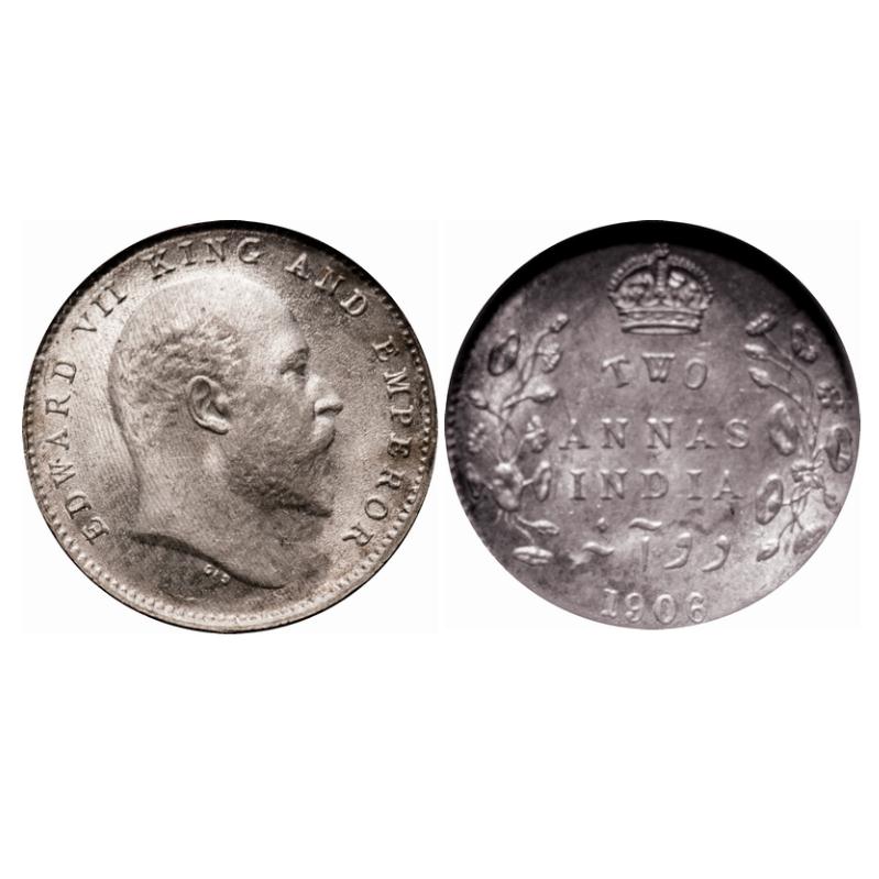 Edward VII, Silver, 2 Annas, 1906, Calcutta Mint, No mint mark, Ghost on Rev. GK 983. NGS Slabbed. MS 63+ Brilliant. Rare.