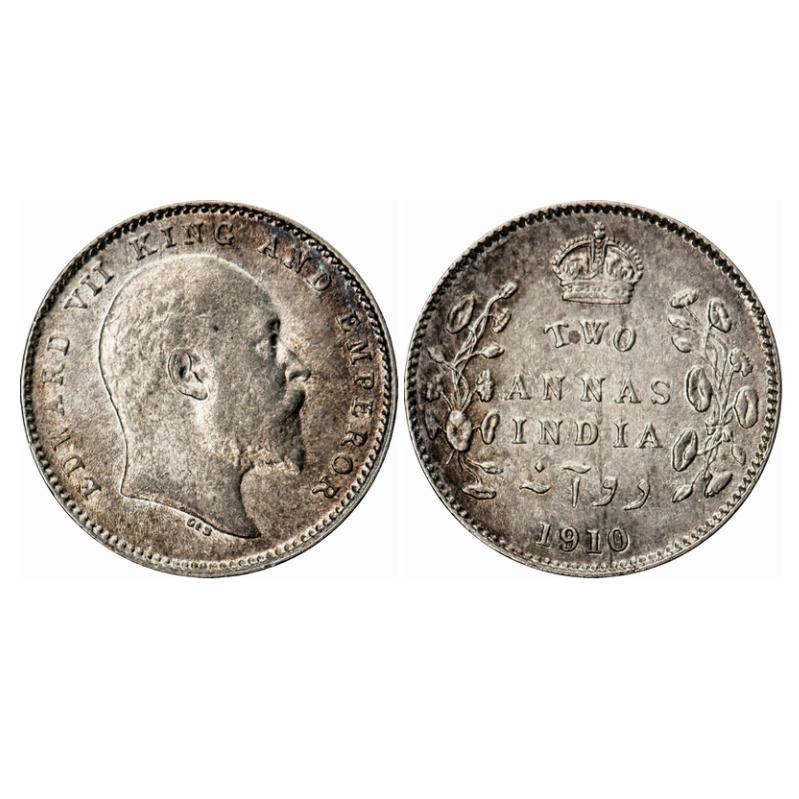 Edward VII, Silver, 2 Annas, 1910, Calcutta Mint, No mint mark. GK 987. Extremely Fine+. Scarce.