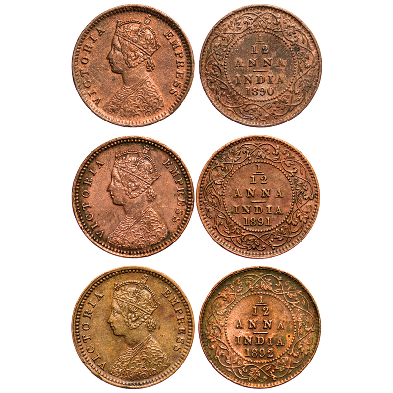 | Victoria Empress, Copper, 1/12 Anna (3 coins), 1) 1890, Calcutta Mint, Obv 'B', No mint mark, 2) 1891, Calcutta Mint, Obv 'B', No mint mark, 3) 1892, Calcutta Mint, Obv 'B', No mint mark. F. Prid # 795, 796, 797. GK 911, 912, 913. Very Fine+ to Extremely Fine+. Scarce as a lot. |