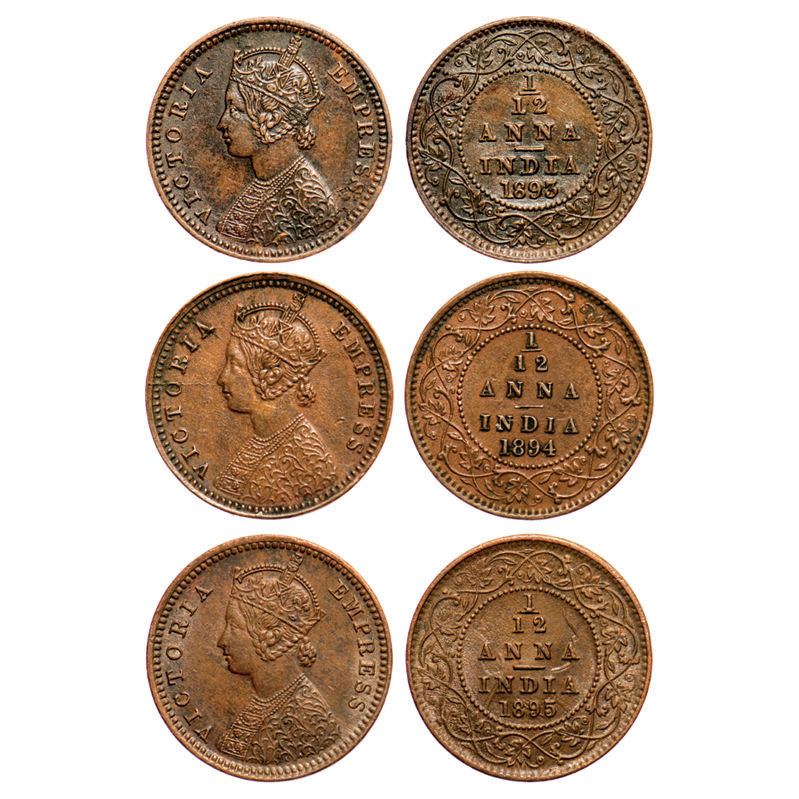 | Victoria Empress, Copper, 1/12 Anna (3 coins), Calcutta Mint, Obv 'B', No mint mark, 1) 1893, 2) 1894, Die crack on Rev, 3) 1895, Ghost on Rev. F. Prid # 798, 799, 800. GK 914, 915, 916. Very Fine+ to Extremely Fine+. Scarce as a lot. |