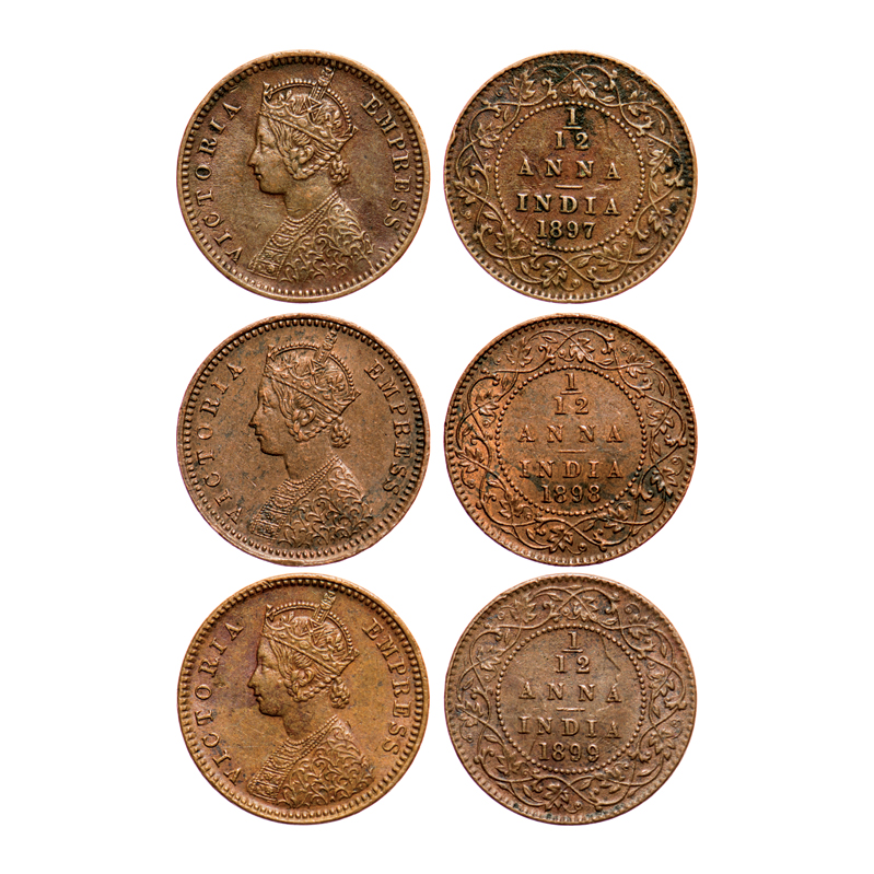 | Victoria Empress, Copper, 1/12 Anna (3 coins), Calcutta Mint, Obv 'B', No mint mark, 1) 1897, 2) 1898, 3) 1899, Ghost on Rev. F. Prid # 802, 803, 804. GK 918, 919, 920. Very Fine+, Details to Extremely Fine. Scarce as a lot. |