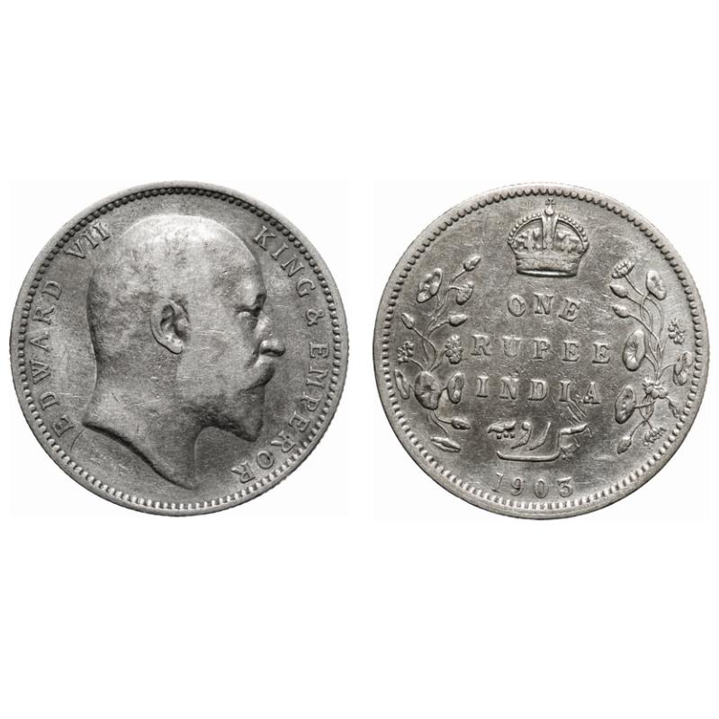 | Edward VII, Silver, Rupee, 1903, Calcutta Mint, No mint mark, Error, 3 Diamond, 11' o clock Die rotation on Obv. F. Prid # 189. GK 922. About Extremely Fine. Rare. |