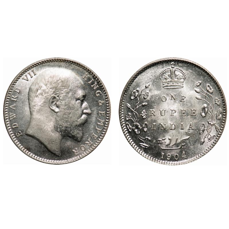 | Edward VII, Silver, rupee, 1904, Bombay Mint, 'B' incused and Dot, 5 Diamonds and bottom stroke of numeral '4' long, Numeral 4 of year date 1904 is double struck, Ghost on Rev. F. Prid # 200. GK 933. Brilliant Uncirculated with original mint luster. Rare. |
