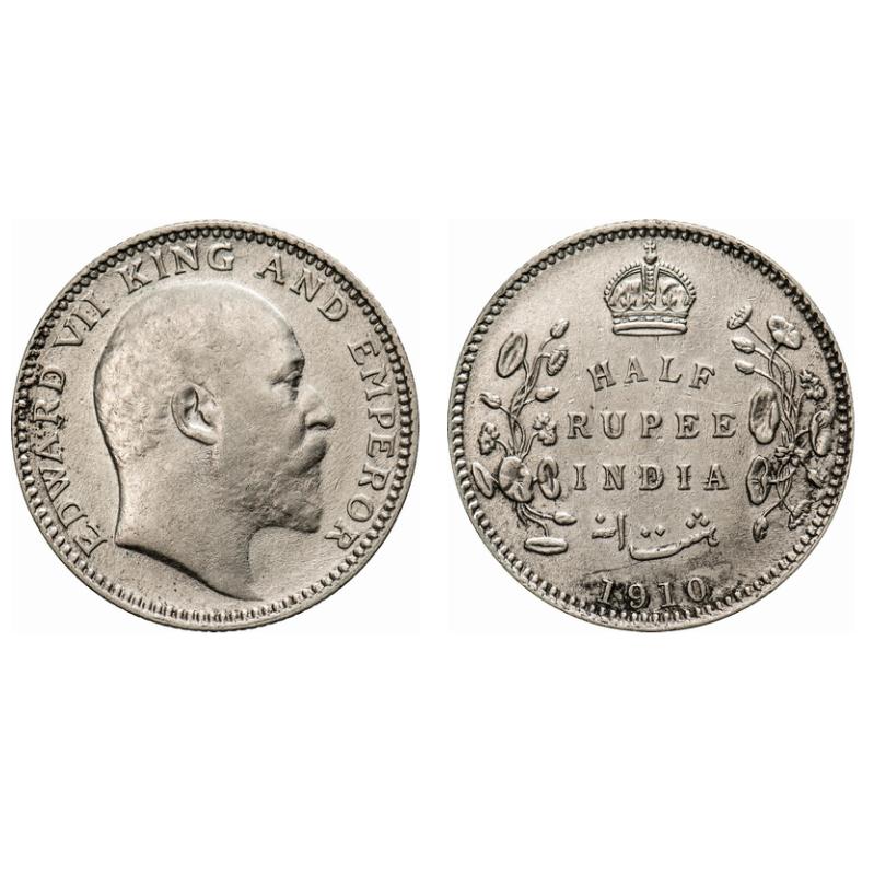 Edward VII, Silver, Half Rupee, 1910, Calcutta Mint, No mint mark. F. Prid # 314. GK 971. Extremely Fine. Scarce.