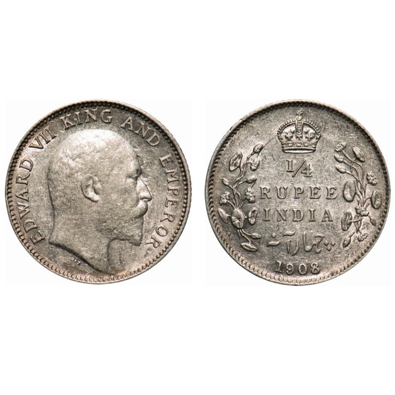 Edward VII, Silver, 1/4 Rupee, 1908, Calcutta Mint, No mint mark, Ghost on Obv and Rev. F. Prid # 437. GK 977. Extremely Fine+. Scarce.