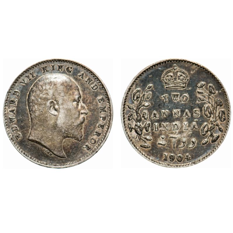 Edward VII, Silver, 2 Annas, 1904, Calcutta Mint, No mint mark. F. Prid # 557. GK 981. Toned, Extremely Fine+. Scarce.