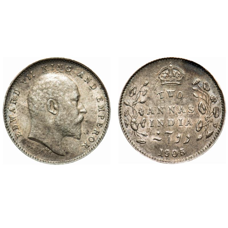 Edward VII, Silver, 2 Annas, 1905, Calcutta Mint, No mint mark, Die crack on Obv. F. Prid # 558. GK 982. Extremely Fine. Scarce.
