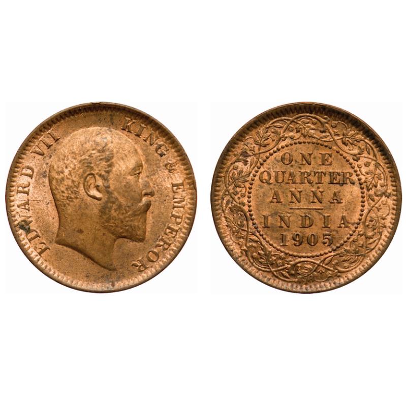 Edward VII, Copper, Quarter Anna, 1905, Calcutta Mint, No mint mark, Die cracks on Obv. F. Prid # 649. GK 996. Uncirculated. Scarce.