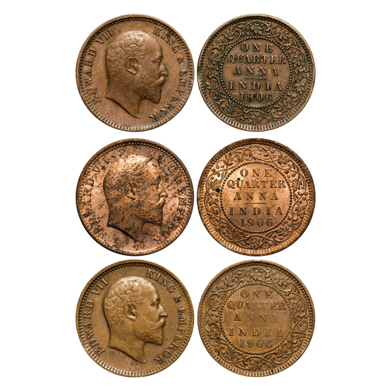 | Edward VII, Copper & Bronze, Quarter Anna (3 coins), Calcutta Mint, No mint mark, 1) 1906, Copper, 6.52 gm, 2) 1906, Copper, 6.42 gm, 3) 1906, Bronze, 4.38 gm, Die crack on Rev. F. Prid # 650, 650, 651. GK 997, 997, 998. About Very Fine to Uncirculated, Details. Scarce as a lot. |