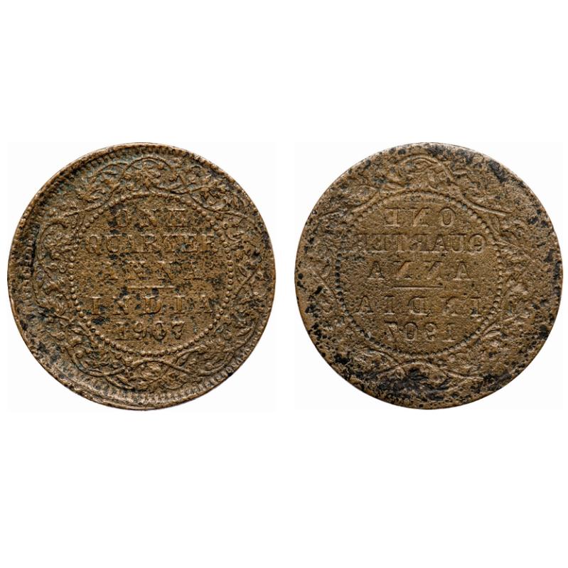 | Edward VII, Bronze, Quarter Anna, 1907, (4.47 g) (25.47 mm), Calcutta Mint, No mint mark, Error, Rev Lakhi/Brockage. Fine+, Harshly Cleaned. Rare. |