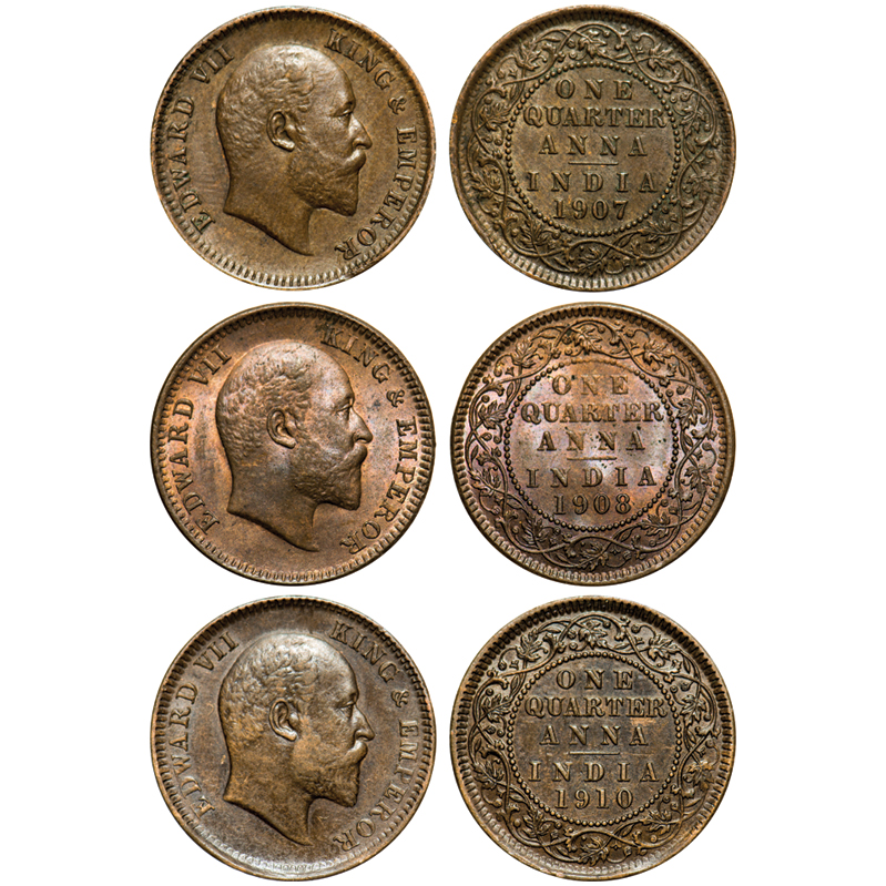 | Edward VII, Bronze, Quarter Anna (3 coins), 1907, 1908, 1910, Calcutta Mint, No mint mark. F. Prid # 652, 653, 655. GK 999, 1000, 1002. Very Fine+ to Almost Uncirculated. Scarce. |